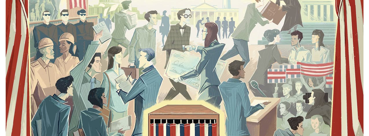 The feature story for this issue was to be "Behind the scenes in politics", a look at Alumni who were working in various levels of government. In particular, it was important that the illustration NOT become a satirical or a partisan piece. The magazine editors already had a conceptual direction when they turned to me; they wanted an illustration showing the divide between the hustle and bustle of the political arena and the solitary dimension of the voting experience.